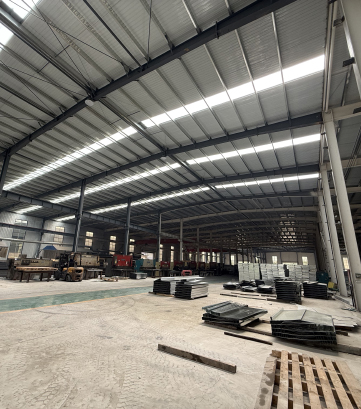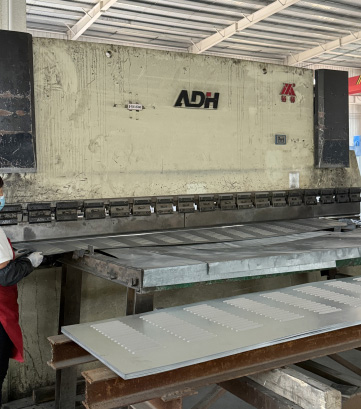 面板自動下料、沖孔壓彎、表面靜電噴涂、H型鋼自動埋弧焊接四條自動化生產線